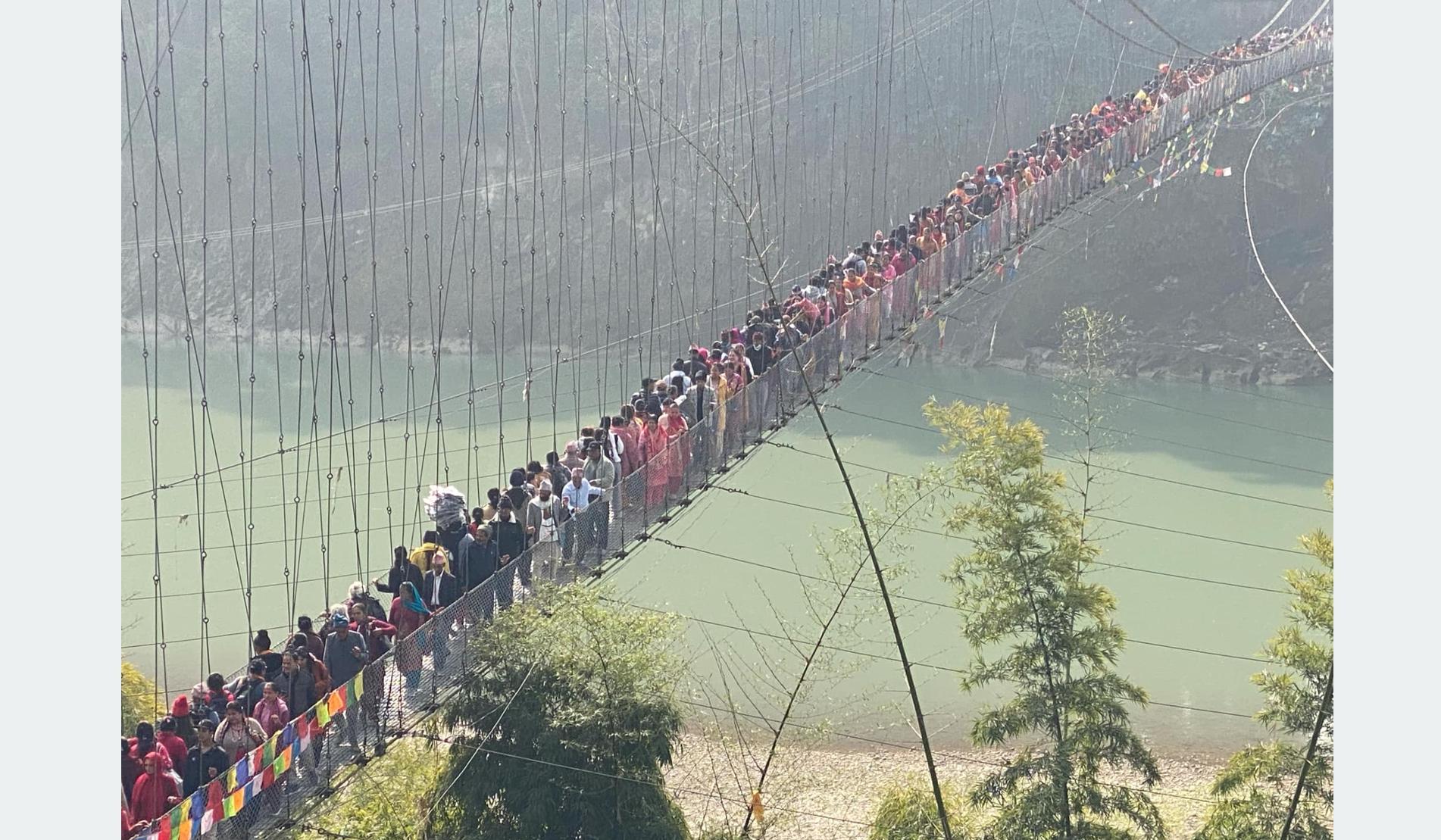 जोखिमयुक्त झोलुङ्गे पुलमार्फत यात्रा गर्न बाध्य भक्तजन