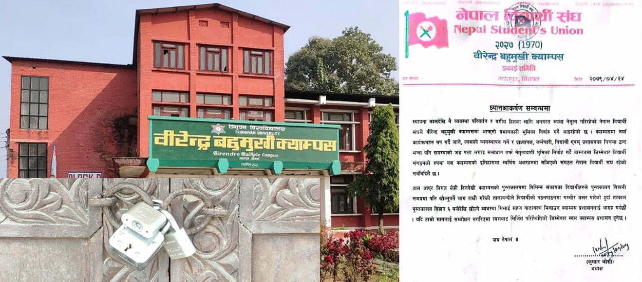 वीरेन्द्र क्याम्पसको पुस्तकालयमा तालाबन्दी : नेविसंघले भन्यो– ‘माग पूरा गरेर तालाबन्दी खुलाउने वातावरण बनाउ’