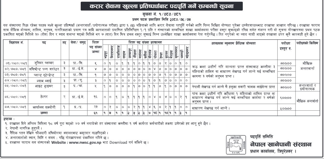 खानेपानी संस्थानमा खुल्यो जागिर, साधारण लेखपढ गर्न जानेकालाई समेत अवसर [हेर्नुस् सूचनासहित]