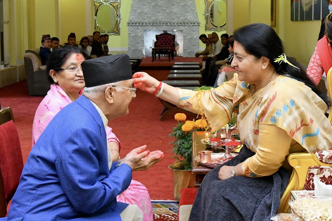 ओली दम्पत्तीले राष्ट्रपतिको हातबाट लगाए टीका