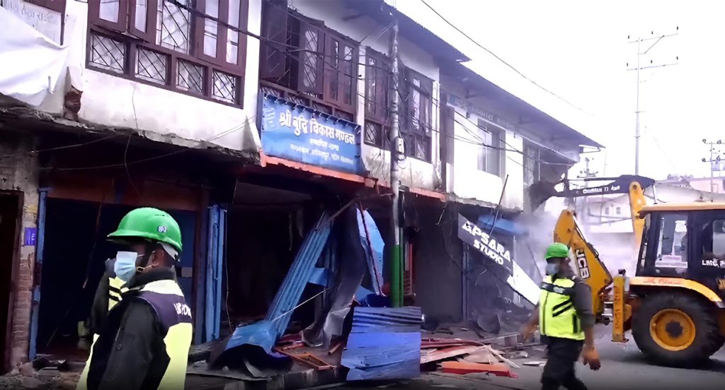 ललितपुरको न्हु: पोखरीको जग्गा मिचेर बनाइएका घर महानगरले भत्कायो