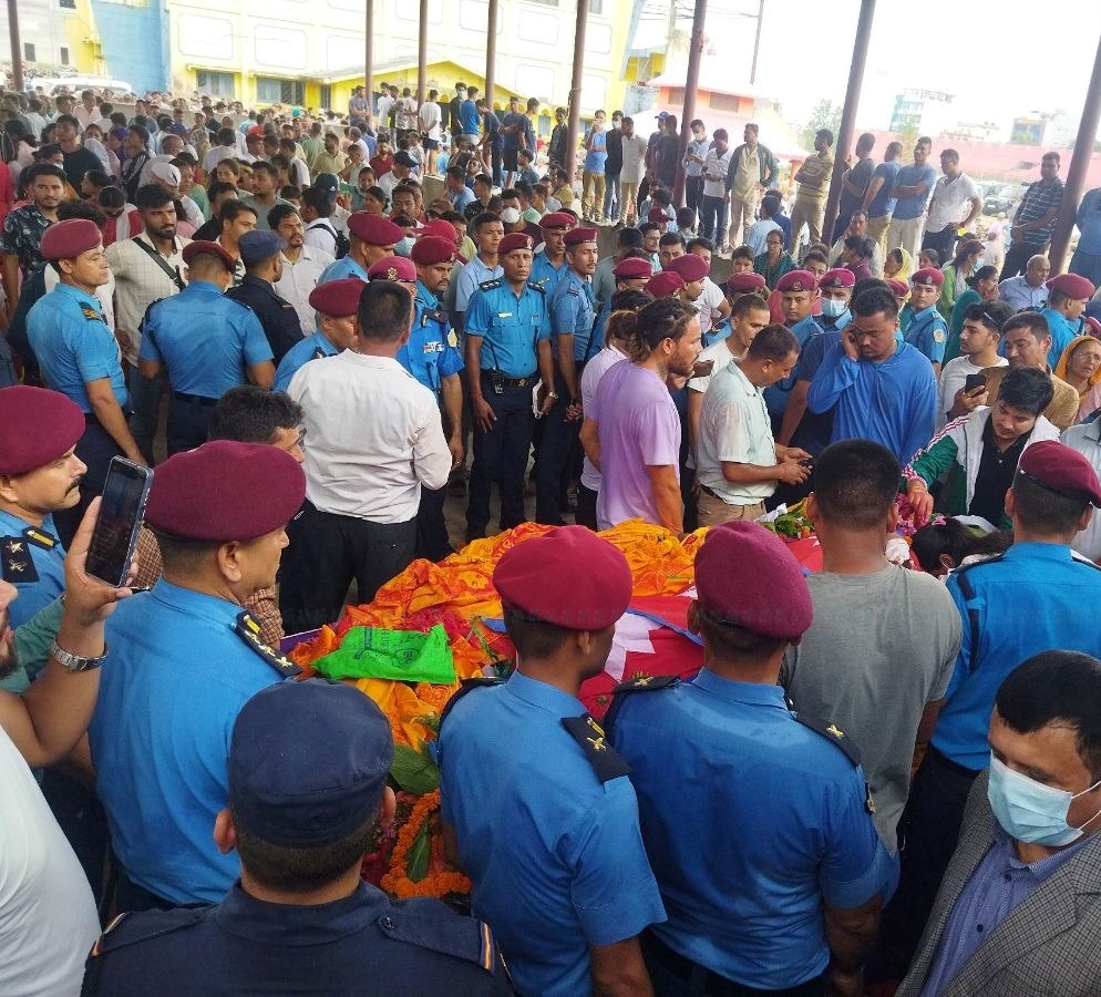 कार दुर्घटनामा निधन भएका मन्त्री सिंहको पार्थिव शरीरमाथि श्रद्धाञ्जली अर्पण गरिँदै