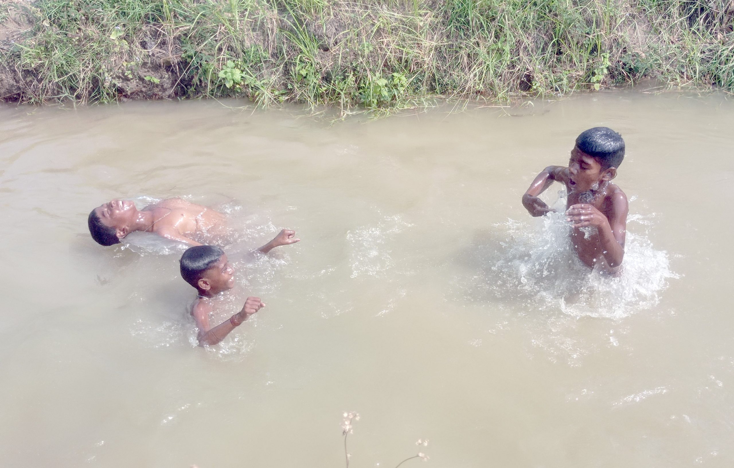 गर्मीले जनजीवन प्रभावित, नहरमा पौडी खेल्दै बालबालिका
