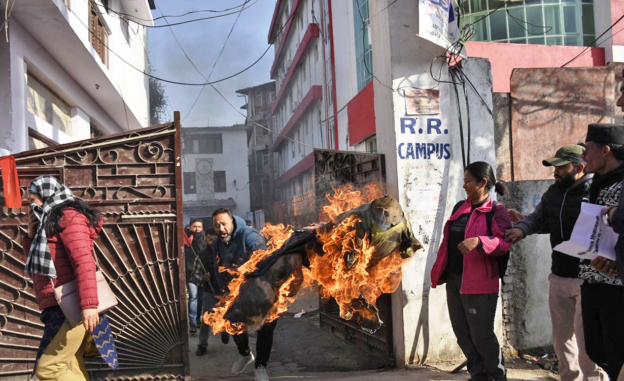 शिक्षामन्त्री शिशिर खनालको अनेरास्ववियूले जलायो पुत्ला