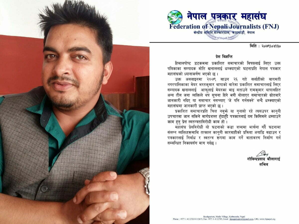 प्रकाशित समाचारको विषयलाई लिएर पत्रकार खनाललाई धम्क्याएको घटनाप्रति महासंघको विरोध