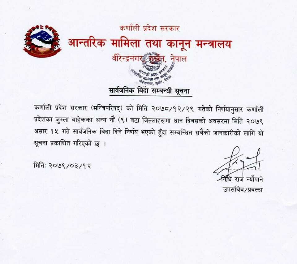 कर्णाली प्रदेशले असार १५ मा सार्वजनिक बिदा दिने