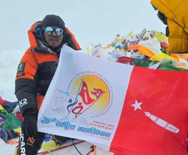सर्वोच्च शिखर सगरमाथाको चुचुरोमा अनेरास्ववियुको झन्डा