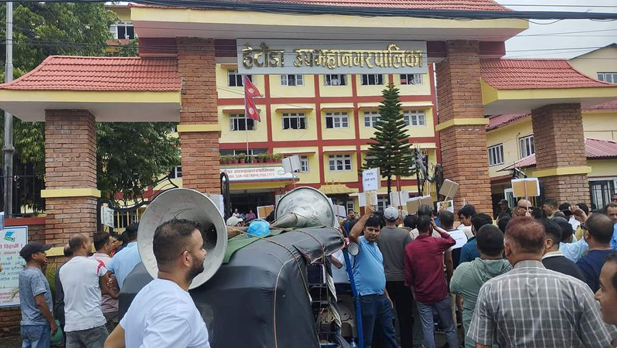 कर वृद्धिको विरोधमा हेटौंडा उपमहानगरको गेटमा व्यवसायीको धर्ना