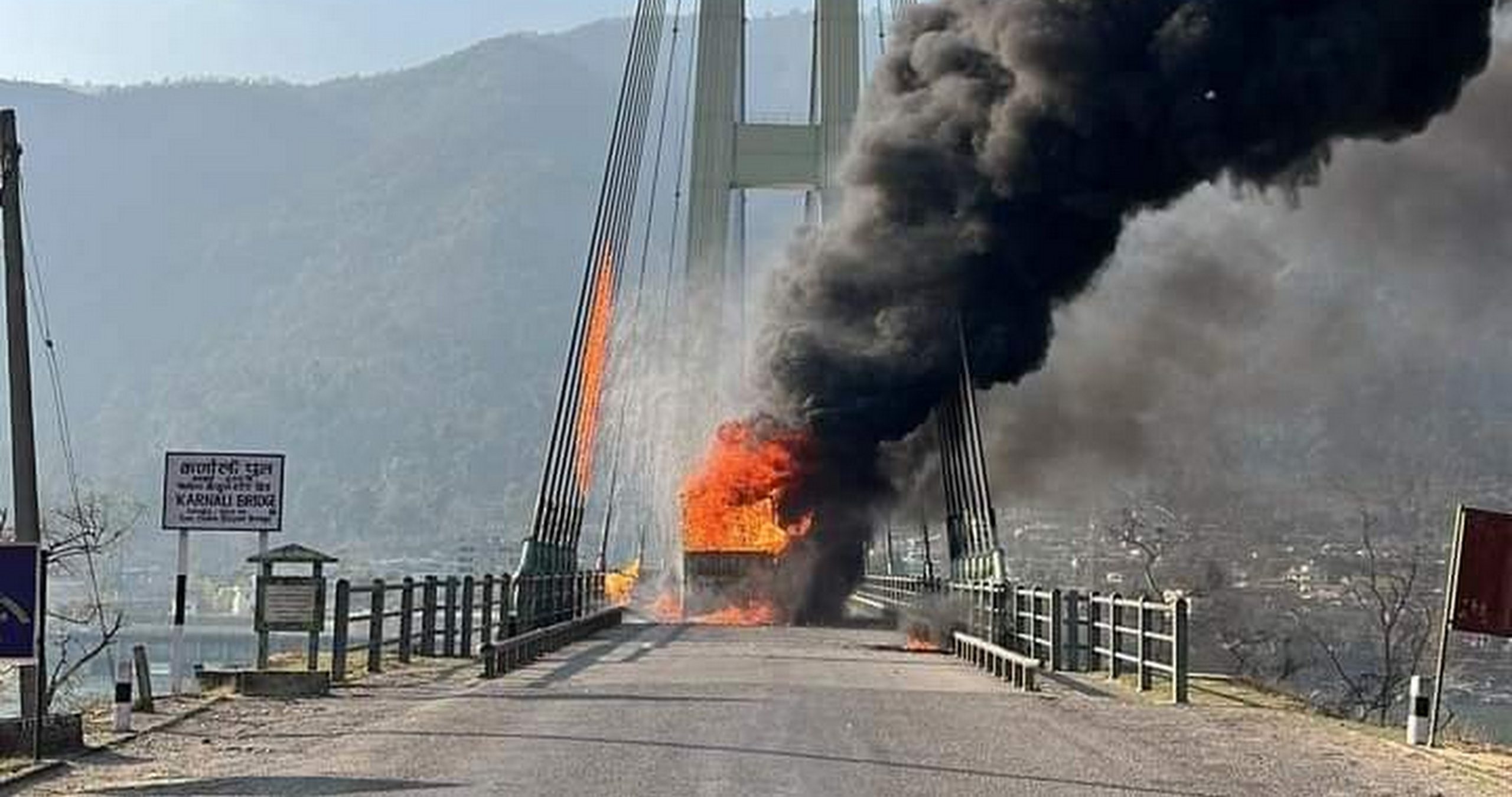 कर्णाली पुुलमा सवारीसाधन आवागमन बन्द : आगलागीबाट ‘सपोट’ डोरीमा आंशिक क्षति