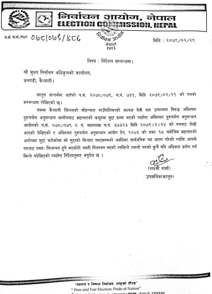 अख्तियारको पत्रपछि गाउँपालिकाका अध्यक्ष स्वत: निलम्बित, कुनै पनि अधिकारको प्रयोग गर्न नदिन निर्देशन