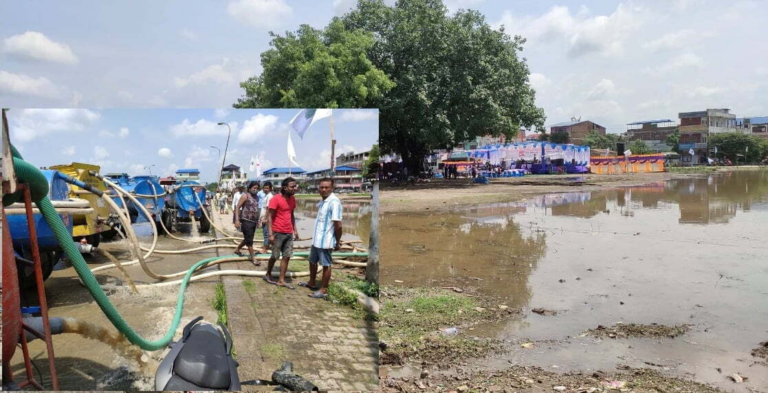भरतपुरमा गठबन्धनको आमसभा स्थल डुबानमा परेपछि सेफ्टी ट्ंयाकरले पानी तानियो, माटो भरेर डोजरले सम्म्याइयो (फोटो/भिडियो)