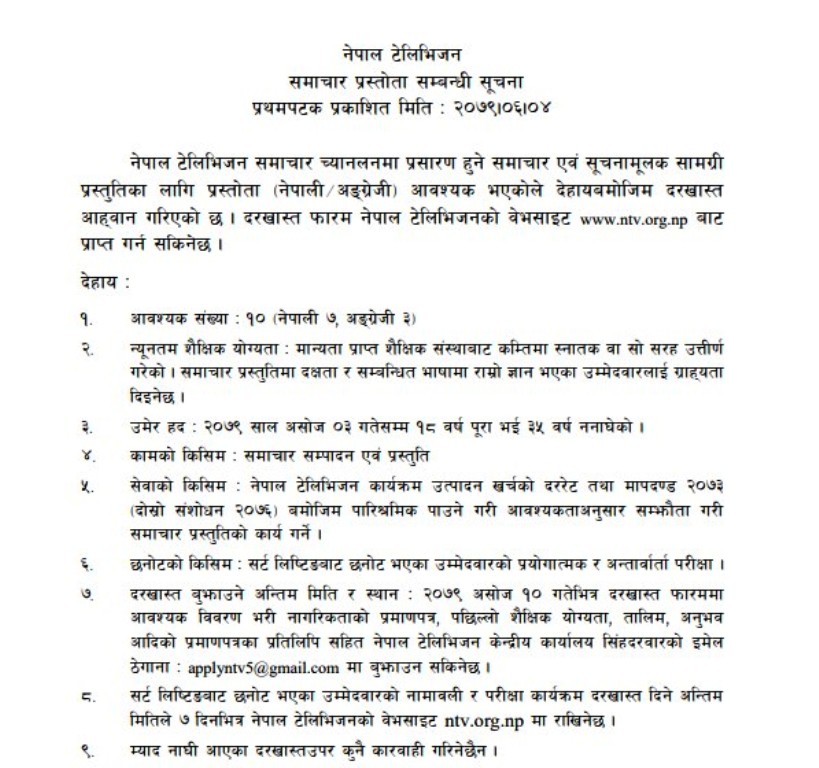 नेपाल टेलिभिजनले माग्यो समाचार प्रस्तोता, लिखित परीक्षा दिनु नपर्ने